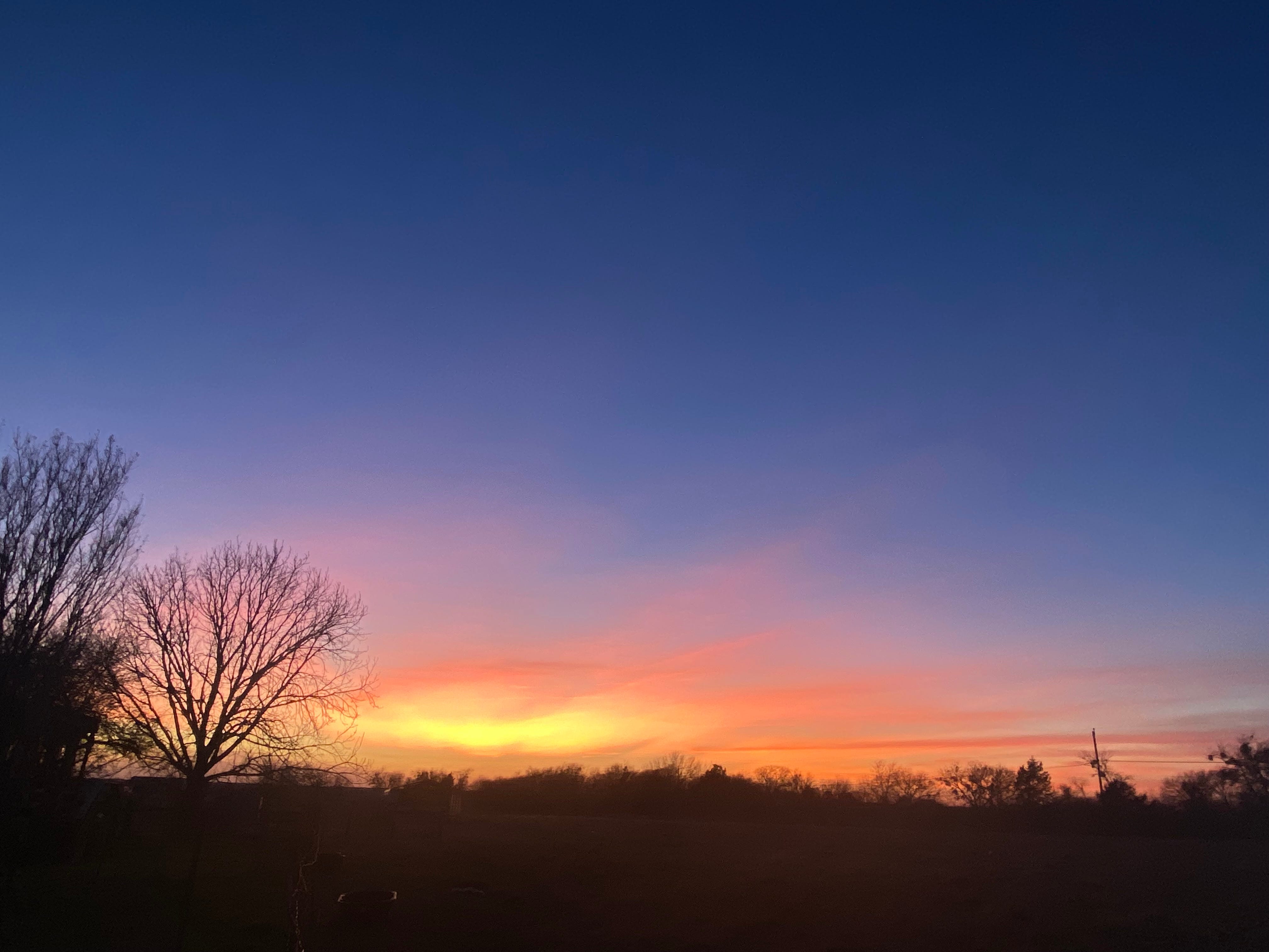 Bare branched against pink and blue sky reminds me that I was once young and unencumbered with worries. The picture so matches the post. I needed a good kick to the seat of the pants.